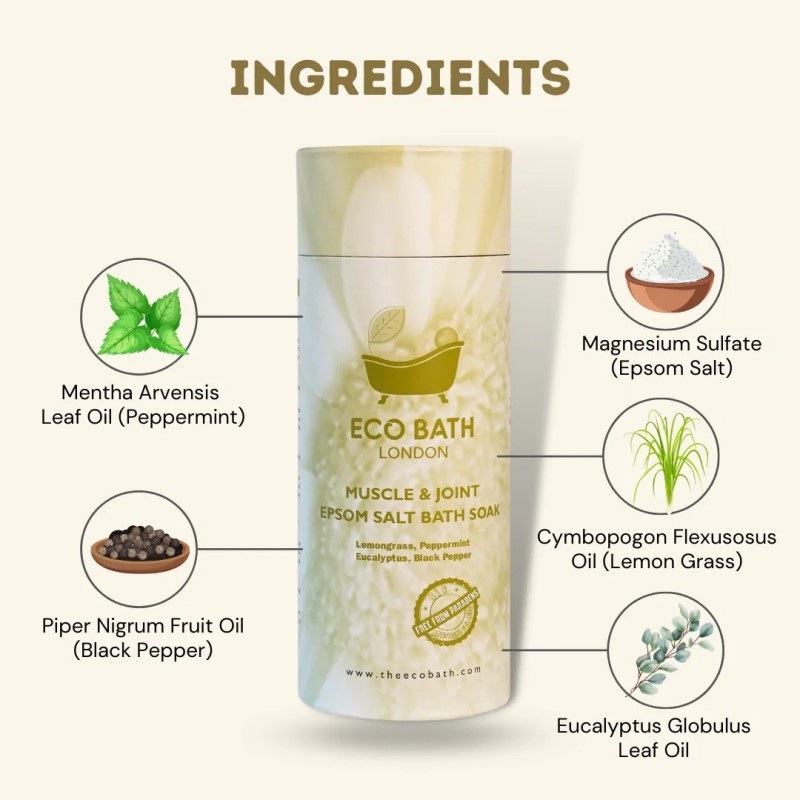 "Το Eco Bath London Muscle and Joint salt soque προσφέρει μια καταπραϋντική εμπειρία μέσω ενός επανορθωτικού μείγματος αλατιού Epsom και αιθέριων ελαίων.
