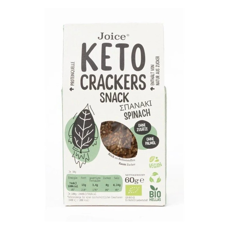 "Ανακάλυψε τα κέτο κράκερς Joice με σπανάκι, το ιδανικό τραγανό σνακ για όσους ακολουθούν κετογονική ή χαμηλών υδατανθράκων διατροφή.