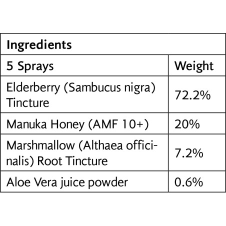 - Συστατικά: Organic Manuka Honey AMF 10+ 20%, Organic alcohol, Organic fresh black Elderberry extract 73%, Organic fresh Marshmallow Extract 7%, Organic Aloe Vera Juice Extract (Equivalent to 65% of tincture base). ✓ Κατάλληλο για χορτοφάγους. ✓ Χωρίς προσθήκη γαλακτοκομικών, σιταριού, ζάχαρης, καλαμποκιού και σόγιας. ✓ Κατασκευάζεται χωρίς γενετικά τροποποιημένους οργανισμούς."