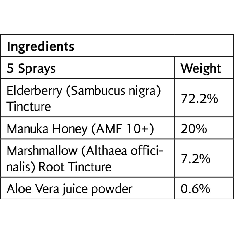 Παρέχει ανακούφιση απευθείας εκεί που χρειάζεται περισσότερο μέσω μιας αποτελεσματικής αντλίας ψεκασμού. Τα elderberries έχουν αναγνωριστεί ως πολύ καλή πηγή βιταμίνης C, που συμβάλλει στη φυσιολογική λειτουργία του ανοσοποιητικού συστήματος. Το elderberry έχει αποδειχθεί ότι συμβάλλει στην καταπράυνση του κοινού κρυολογήματος, ενώ η ρίζα marshmallow (Althaea officinalis) επιδεικνύει αντιβακτηριακή δράση και είναι καταπραϋντική για το στόμα και το λαιμό.