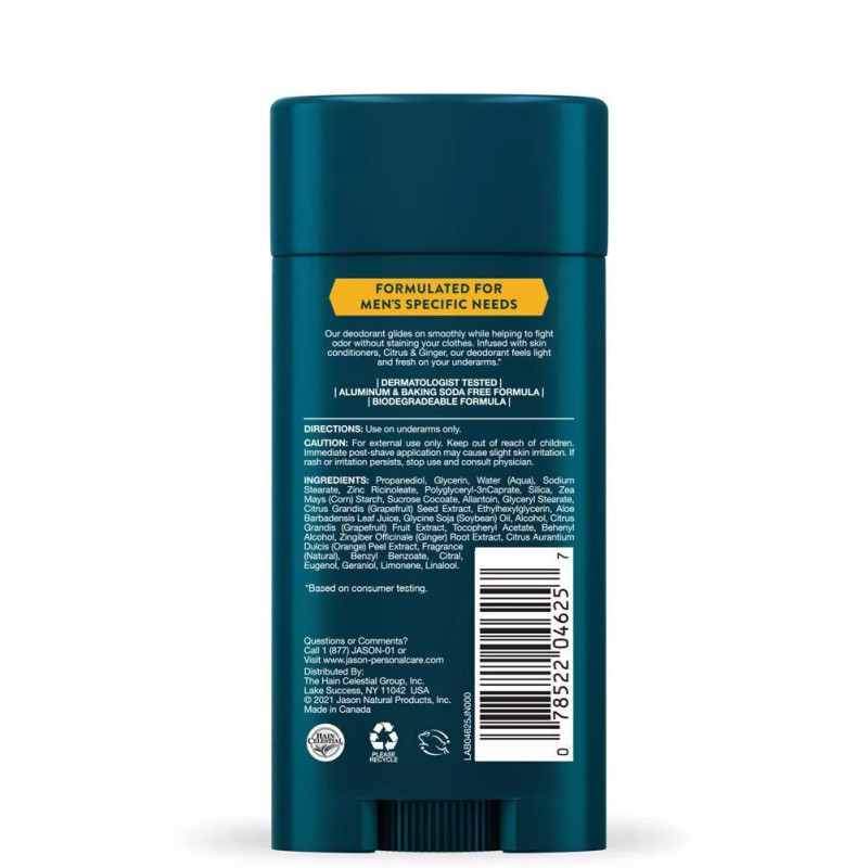 Αποσμητικό σώματος με άρωμα της Jason σε μορφή στικ. Καταπολεμά την κακοσμία, αντιμετωπίζοντας τα βακτήρια και τους μικροοργανισμούς που την προκαλούν. Τα βασικά ενεργά συστατικά του αποτελούνται κυρίως από παράγωγα φαινόλης, αιθανόλης και αιθέριων ελαίων, τα οποία εμποδίζουν τον βακτηριδιακό πολλαπλασιασμό χωρίς, ωστόσο, να εμποδίζουν την έκκριση ιδρώτα.