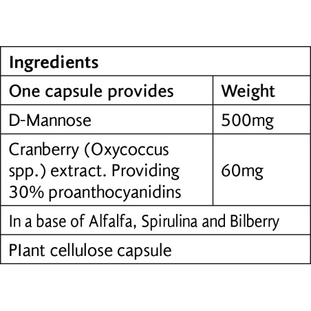 - "Συστατικά: One capsule provides Weight D-Mannose 500mg Cranberry (Oxycoccus spp.) extract. Providing 30% proanthocyanidins 60mg In a base of Alfalfa, Spirulina and Bilberry PIant cellulose capsule"