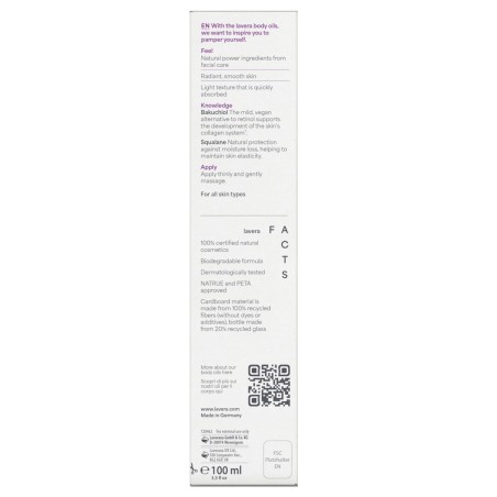 - Εφαρμόστε μια λεπτή στρώση και κάντε απαλό μασάζ σε νωπό ακόμα δέρμα. Το λάδι σώματος μπορεί να αναμειχθεί με όλες τις λοσιόν σώματος (Body Lotions) μας. Για πολύ ξηρό δέρμα, απλά προσθέστε μερικές σταγόνες λάδι στην λοσιόν lavera της επιλογής σας. Φυλάσσεται προστατευμένο από το φως και τη θερμότητα.