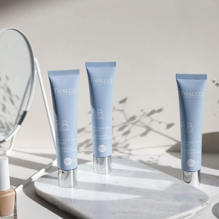 "Ένα σύμπλεγμα 24ωρης ενυδάτωσης, με άρωμα θαλάσσιας αύρας και κρέμας BB. Αυτό το υβριδικό προϊόν δημιουργήθηκε αποκλειστικά από την THALGO και αποκαλύπτει ένα δέρμα χωρίς ατέλειες. Το σύμπλεγμα Sève Bleue des Océans προσδίδει ενυδάτωση, ενώ τα σάκχαρα των φυκιών λειαίνουν και ανακουφίζουν το δέρμα, επιτρέποντας στις χρωστικές να προσφέρουν λάμψη και να ενισχύσουν την επιδερμίδα.