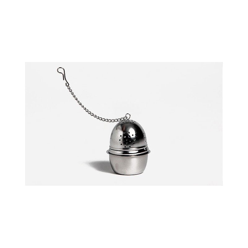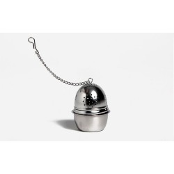 Ανοξείδωτο μεταλλικό φίλτρο σε σχήμα αυγού με αλυσίδα. Συνοδεύεται από ένα μικρό δοχείο υποδοχής.
