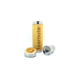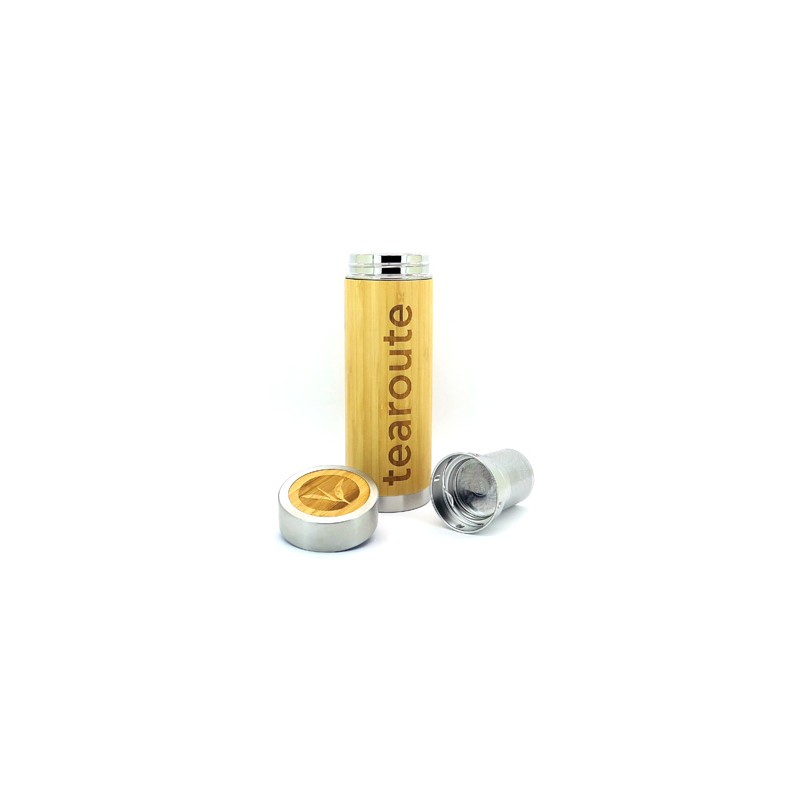 Θερμός από ανοξείδωτο ατσάλι με ενσωματωμένο φίλτρο για τσάι και εξωτερικό τοίχωμα από μπαμπού διακοσμημένο με το logo του δρόμου του τσαγιού.