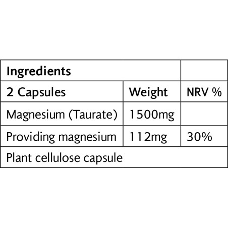 - "Συστατικά: 2 Capsules Weight NRV % Magnesium (Taurate) 1500mg Providing magnesium 112mg 30% Plant cellulose capsule"