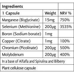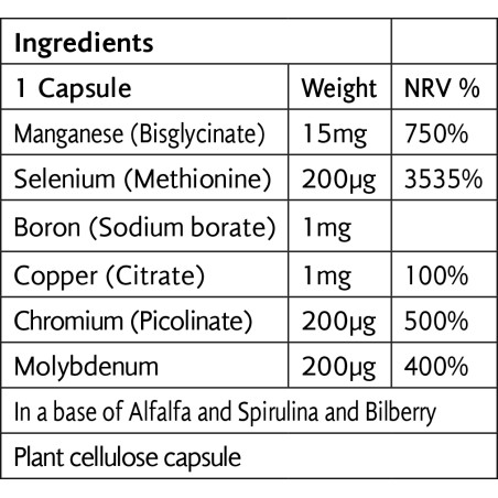 "Συστατικά: Μία χορτοφαγική κάψουλα παρέχει: Manganese (bisglycinate) 15mg, Selenium (L-selenomethionine) 200ug, Boron (sodium borate) 1mg, Copper (citrate) 1mg, Chromium (picolinate) 200ug, Molybdenum (ammonium molybdate) 200ug. In a base of alfalfa, spirulina & bilberry. ✓ Κατάλληλο για χορτοφάγους και βιγκάνς. ✓ Χωρίς προσθήκη γαλακτοκομικών, σιταριού, ζάχαρης, καλαμποκιού και σόγιας. ✓ Κατασκευάζεται χωρίς γενετικά τροποποιημένους οργανισμούς."