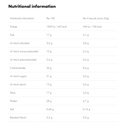 Συστατικά: Αλεύρι σόγιας (34%) - Αλεύρι ολικής αλέσεως (16%) - Καστανή ζάχαρη (16%) - Έξτρα παρθένο ελαιόλαδο (11%) - Σταγόνες μαύρης σοκολάτας (κακάο 75% τουλάχιστον) (7,2%) (πάστα κακάο, κακάο σε σκόνη με μειωμένα λιπαρά, καστανή ζάχαρη, βούτυρο κακάο, γαλακτωματοποιητής: λεκιθίνες (από σόγια), φυσική αρωματική ύλη) - Ανθεκτικό άμυλο καλαμποκιού (7,1%) - Υδρολυμένες πρωτεΐνες σιταριού (6,9%) - Γαλακτωματοποιητής: λεκιθίνες (από σόγια) - Πάστα φουντουκιού - Διογκωτικό μέσο: ανθρακικά άλατα νατρίου - Φυσικές αρωματικές ύλες - Αλάτι. Μπορεί να περιέχει άλλους ξηρούς καρπούς, γάλα, αυγά, μουστάρδα. Αυτό το προϊόν πρέπει να χρησιμοποιείται ως μέρος μιας ποικίλης και ισορροπημένης διατροφής και ενός υγιεινού τρόπου ζωής.