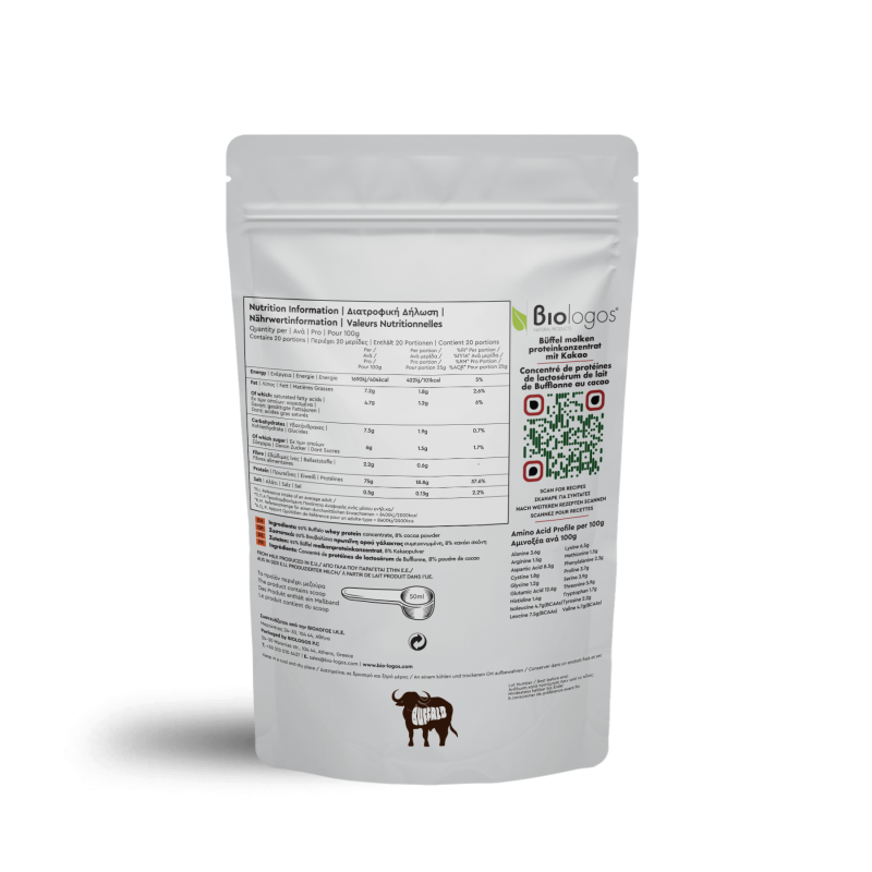 "Η βουβαλίσια πρωτεΐνη ορού γάλακτος Choco 75% “ΒΙΟΛΟΓΟΣ” είναι εμπλουτισμένη με ωμό βιολογικό περουβιανό κακάο, για μεγαλύτερη γευστική απόλαυση. Παράγεται από γάλα βουβαλιών που εκτρέφονται στην Ιταλία, σε φάρμες που ακολουθούν αυστηρά πρότυπα βιώσιμης κτηνοτροφίας. Τα βουβάλια ζουν σε ανοιχτούς χώρους, τρέφονται φυσικά και παράγουν γάλα εξαιρετικής ποιότητας, το οποίο είναι γνωστό για την υψηλή του θρεπτική αξία.