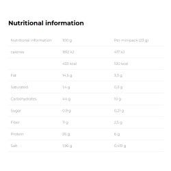 - Συστατικά: Πρωτεΐνη σόγιας (36,2%) - Αλεύρι ρυζιού - Αλεύρι καλαμποκιού - Ηλιέλαιο - Φυσικό άρωμα - Άμυλο καλαμποκιού και ταπιόκας - Μαλτοδεξτρίνη - Αλάτι - Σκόνη ντομάτας - Αφυδατωμένος μαϊντανός - Αντιοξειδωτικό: εκχυλίσματα δεντρολίβανου. Μπορεί να περιέχει γάλα.